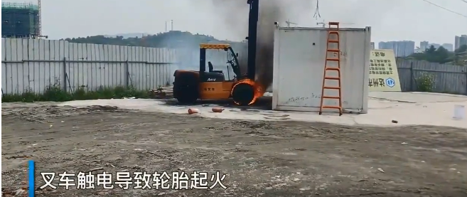 叉車觸電導致輪胎起火,消防利用泡沫點射成功處置。